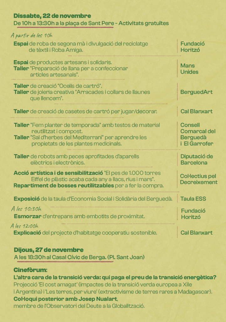 Per altra banda, el dijous 27 de novembre a les 18:30 h, el Casal Cívic i Comunitari de Berga acollirà un cinefòrum on es projectaran els documentals El cost amagat i Les terres per viure. Aquesta activitat, coordinada per l’Ateneu Cooperatiu de la Catalunya Central, tancarà les activitats de la Setmana Europea de la prevenció de residus al Berguedà.